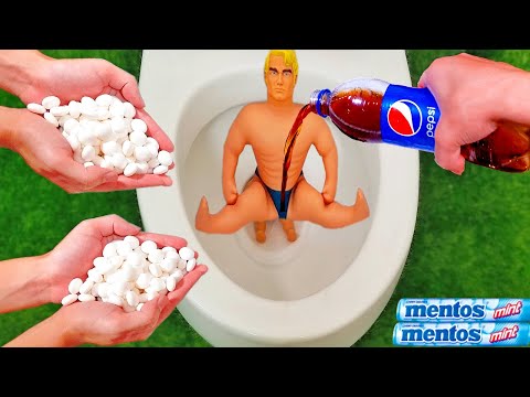 Experiment video : Stretch Armstrong VS Cola, Monster, Fanta, Sprite, Pepsi and Mentos in Toilet...